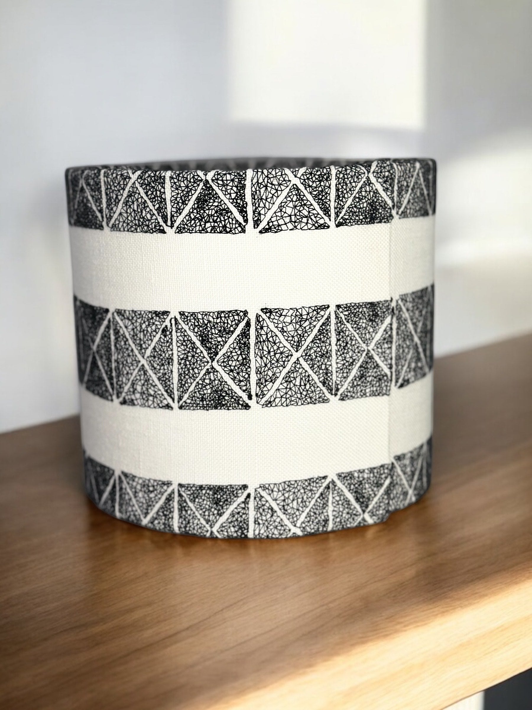 This Black & White Embroidered Drum Lampshade brings monochrome sophistication to any space. Handcrafted using premium-quality embroidered fabric imported from the UK, this 20cm (diameter) x 18 cm (height) shade features intricate black-on-white embroidery for a striking contrast that complements both modern and traditional interiors.