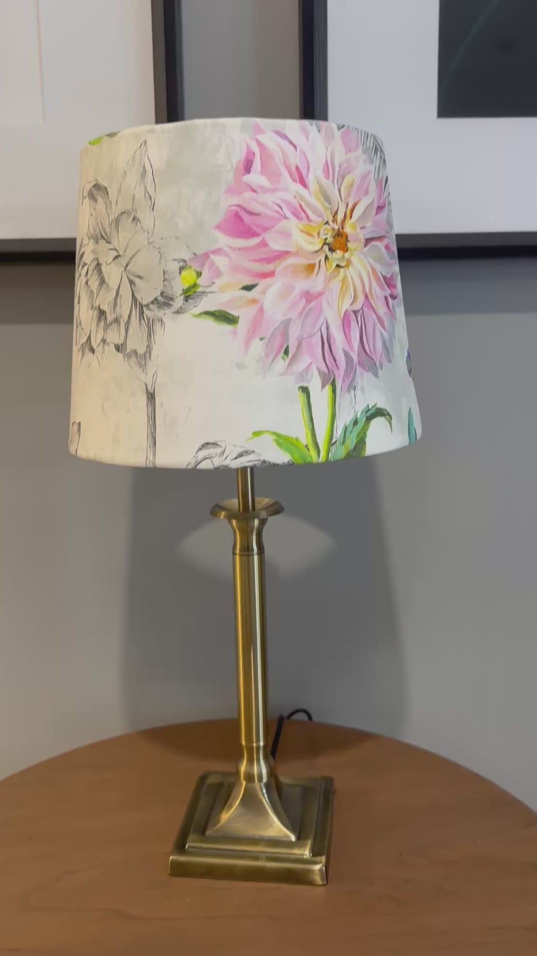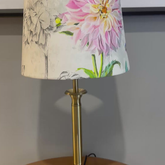 The Graphite Garden lampshade showcases a stunning continuous fabric design, where intricate motifs flow seamlessly all around, creating a captivating visual experience. The delicate floral patterns, rendered in a watercolour paint style, add an artistic touch, enhancing its elegance and charm.