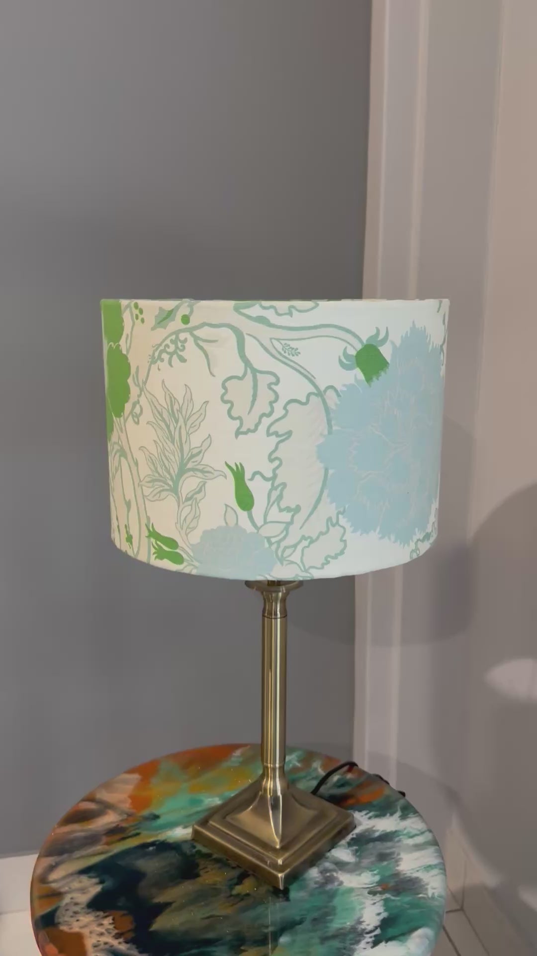 Crafted with the exquisite Aquitaine Wolf Hall fabric, this lampshade showcases a stunning blend of green and light blue hues, creating a refined and luxurious aesthetic. Designed to elevate any space, its sophisticated color palette and intricate detailing make it a perfect statement piece.