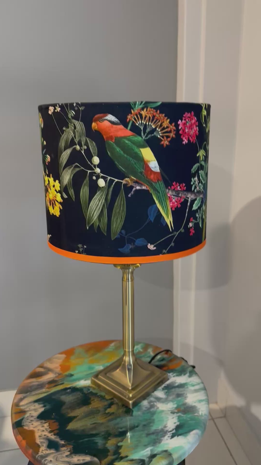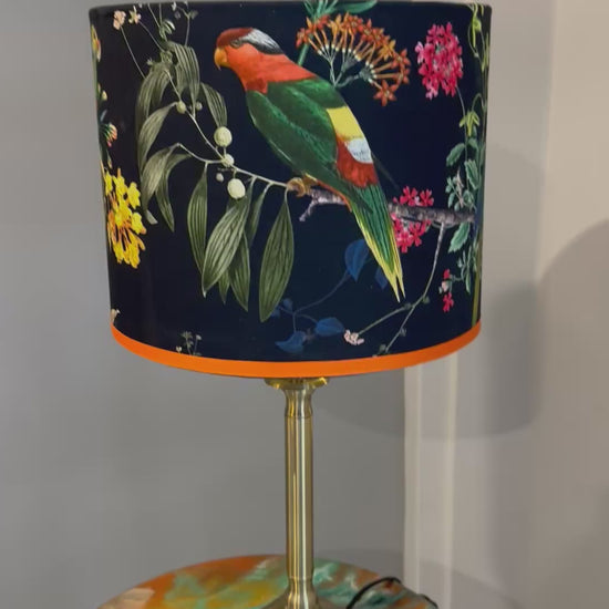 Add a touch of midnight mystery to your space with the Midnight Perch lampshade. Designed in a refined drum shape, this stunning piece features a deep midnight-toned backdrop, where nocturnal birds rest elegantly on branches, quietly observing the world under the moonlit sky. Framed by a delicate orange trim, the shade’s rich hues blend seamlessly, creating a warm, balanced contrast.