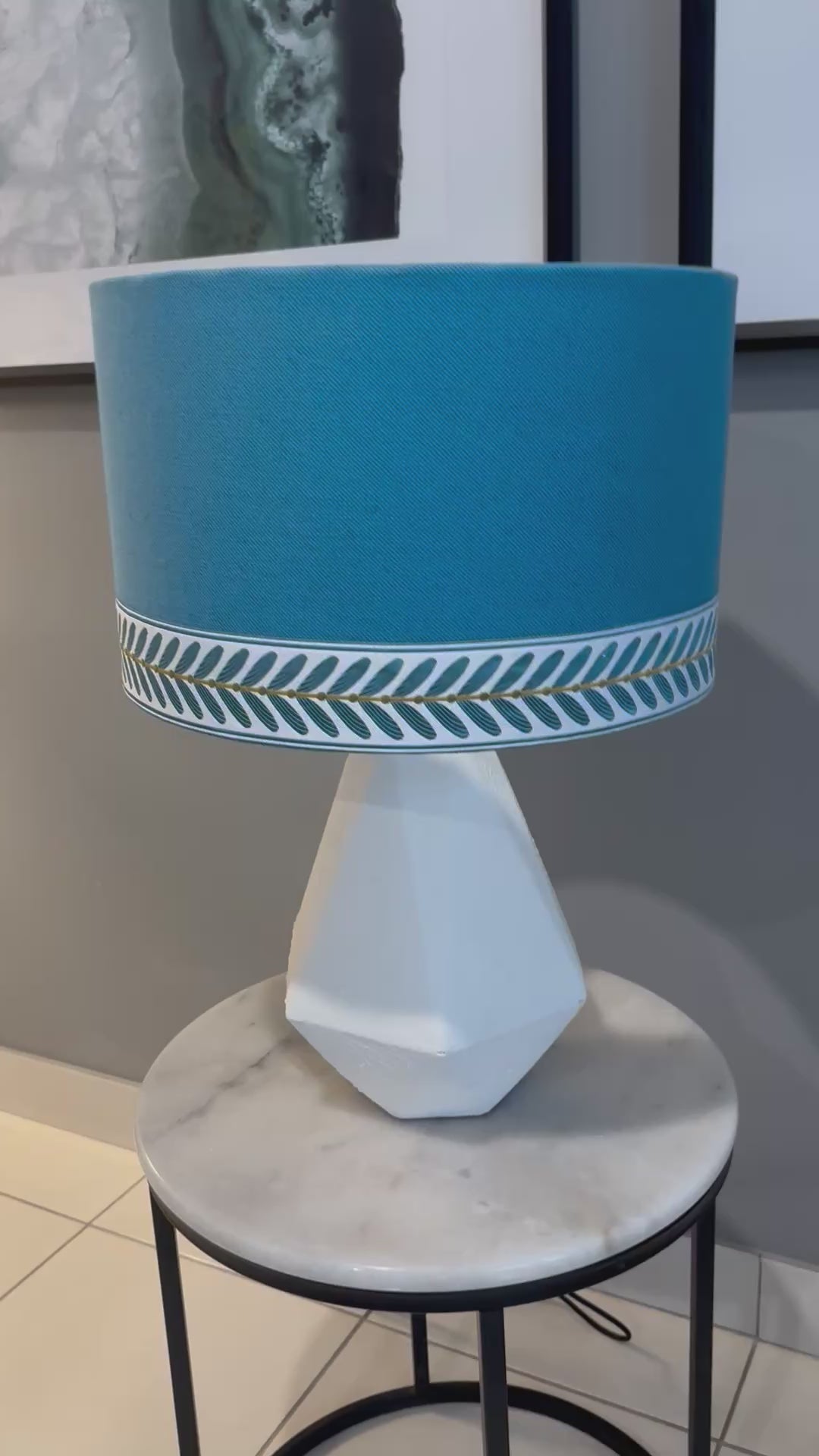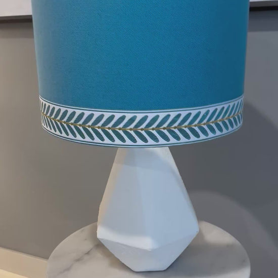 Crafted from premium Warwick fabric in a rich teal hue, the Seaside Grace lampshade exudes a refined yet modern charm. Its elegant teal and white trim enhances the fabric’s depth, creating a sophisticated contrast that elevates any space.